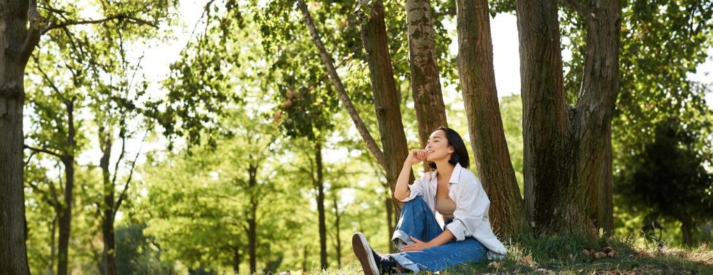 Lenken Sie Tageslicht mit hellen Wandfarben, reflektierenden Decken, Spiegeln und leichten Vorhängen in den Raum. Halten Sie Fensterbänke frei, nutzen Sie Lichtlenklamellen und positionieren Sie Arbeitsbereiche dort, wo morgens die Sonne einfällt. Das wirkt stimmungsaufhellend und reduziert Kunstlicht.